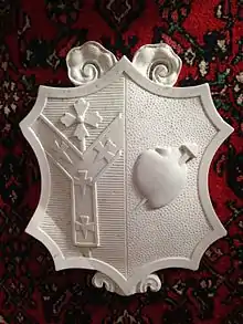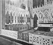 The Cathedra throne projected in three divisions at the second bay on the North side with canopied niches, having crockets and pinnacles and surmounted by a marble spire. The centre of the throne was carved with the arms of the cardinal in statuary marble. The entire crossing was paved with inlaid marbles, designed in squares with quatrefoil panels and crosses and centred on a pietra dura representation of the Cardinal's armorial bearings.
