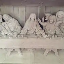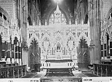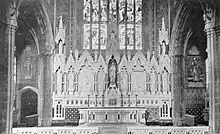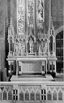 Behind the rood screen, McCarthy's reredos was retained intact but its lower portions were enriched with marble inlays in a diaper pattern with fleur de lis in a vibrant variety of coloured Italian marbles. A new Lady Altar and tabernacle was constructed before the reredos from statuary marble. The antependium contained three bas-relief groups, the work of the eminent Roman sculptor Michele Trepisciano (1860–1913) showing "The Presentation of the Blessed Virgin in the Temple", "The Assumption" and "The Coronation of the Virgin" recessed in separate panels with cusped heads, and columns of Breccia di Seravezza antica and Breccia Corallina marbles. The tabernacle, inlaid with Corsican Jasper, was in the form of a cube topped with a roof of fish scale carvings and finished with two large statuary marble standing angels.