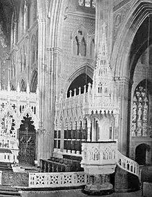 An elaborate pulpit was constructed at the south west pier of the crossing. Composed of statuary marble inlaid with rare coloured marbles, its plan was octagonal, with angle niches containing statues of the Evangelists, St. Patrick and St. Brigid, the canopies above the statues being groined and carved. The panels between the statues were filled with inlaid traceries. The canopy of the pulpit, rising to a height of nearly 36 ft. was carved in Austrian oak painted white and inlaid with coloured enamels and gold leaf.
