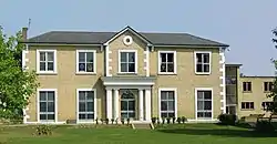 The elegant two-storey, tall-ceilinged house with many windows formed the heart of St Teresa's Convent School and forms the staff and administration building. It is at the end of the Ridings in Green Street and was built during the reign of William IV, that is between 1830 and 1837 to designs by an unknown architect. It is a Grade II listed building. It has a simple Doric porch (portico), central round window and open pediment with two bays to either side. Under John Alliston it became the manor house during a period of the late Industrial Revolution with increasing population in the region, when the products of the manor's agriculture and fishing were insufficient to support the local population. The former manor house close to the Thames was rebuilt in 1851 as Sunbury Park House. These buildings were described as such in a map of 1865.[2] In 1898, it was the home of William Anthony Mitchison, who planted the 1 mile (1.6 km) avenue of horse chestnuts forming The Avenue in the east of his estate. Before the opening of Sunbury Police Station in 1882, Mr Mitchison, who was the local Justice of the Peace (magistrate) had special permission to conduct the court in a room of this grand house.[3][4]