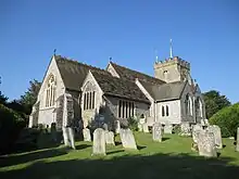 The ground of the parish of Henfield is mostly composed of Weald clay, but towards the centre of the parish are low ridges of plateau gravel lying on Lower Greensand. On one of these, near the old road that ran from Eatons, near Ashurst, to Hurstpierpoint, stands the church of St Peter, rather to the north-west of most of the village's older buildings. The first St. Peter's Church, probably built on the same spot, was founded by thegn Waerbald and his wife Tidburg, to whom Osmund, king of Sussex, granted 15 hides of land for that purpose in the year 770.[1][2] It has been suggested that this church was a minster, i.e. that it held a community of clergymen, but this remains a disputed point.[3]