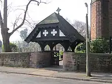 At the entry to the churchyard is a large, ornate lychgate, which was designed by Grayson and Ould, and is contemporary with the church. It consists of a timber canopy on a stone base. The roof is shingled, and the bressumers and bargeboards are finely carved. On top of the lychgate is a cross. It is designated by English Heritage as a Grade II listed building.[5][6] In the churchyard is another memorial to the First World War. This is in Art Nouveau style and carries a Celtic cross, the word "PEACE", and the date of the completion of the war.[5] Also in the churchyard is the grave of Bob Paisley (1919–1996), footballer and manager of Liverpool F.C.[7]