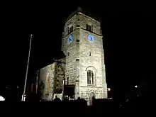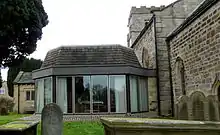 The church was listed as Grade II*, number 1149449, on 18 July 1949 on the grounds that the tower and chancel constitute a medieval element of the dressed and coursed sandstone structure. It has graded-slate roofs. The chancel is lower and narrower than the nave, and was built in the 14th century, the east window tracery dates from 1350.[5][11] Parts of the chancel may be remnants of the earlier 13th-century stone church.[15] The tower was added at the west end in the 15th or 16th century. During the ministry of William Raper and after becoming derelict, the nave was rebuilt in 1772 with Georgian elements in the churchwarden style, including "rounded Georgian windows with amber glass, a plaster ceiling with a decorated cornice, box pews and a three-decker pulpit (all now gone).[5][16] It was restored during the ministry of Mark Rowntree in 1882 to 1884 while the church was closed.[5][11] He replaced the box pews with pitch pine ones and removed the three-decker pulpit. He lowered the nave floor by 2 feet (0.61 m) and raised the chancel floor and ceiling to create the Bentley's burial crypt below. It was probably at this time that the present arch-braced truss ceiling was installed. Before Rowntree's work, the nave floor was higher than those of the tower and chancel.[5] The same section was remodelled again in 1929 when the ceiling and some oak roof beams were replaced, and electric light installed. In 1930 perpendicular windows replaced the Georgian ones. In 1934 the church acquired an organ loft in the tower arch and the ground floor of the tower became a vestry.[15] On the south side a porch and choir vestry were added in 1952, the glazed and polygonal chapter house was built in 1977 and the parish meeting rooms and kitchen in 1988 or 1999.[5][6][8][11]