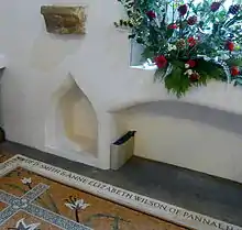 In the walls of the sanctuary are two corbels which have been re-set, and they may indicate the use of a Lenten veil. On the sanctuary floor are early 20th century memorial mosaics, with a crypt below.[11] The chancel contains a 14th century piscina with an ogee opening, but the piscina and the top of the sedilia are low on the wall to the right of the altar, indicating a raising of the stone floor which has 17th and 19th century ledgers.[8][11] It has scribed render walls. The roof was restored in 1884, and is arch-braced with 4.5 bays.[11]