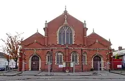 The church is built of brick and stone dressings in the late Gothic style. It originally consisted of a chancel with north vestry rooms, an organ chamber, a south chapel and an aisled and clerestoried nave. Later, a bell-cot, two porches and a polygonal baptistery were added.[3]