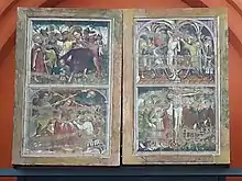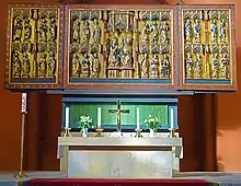 After passing through the main portal, one first reaches the tower basement, which also serves as an entrance hall and provides access to the organ gallery above via two staircases. To the north of the tower adjoins the nave, which, starting from the organ, is flanked on the left and right by a stone gallery. On the north wall of the eastern gallery hangs a sculpture of Christ nailed to a cross, created by the Erfurt artist Hans Walter in 1952. It is intended to commemorate the destruction of the church by bombs and its reconstruction despite difficult conditions.[2] One of the most precious treasures of St Thomas' Church is a three-winged retable from 1445, six metres (19 ft 8 in) wide and 2.3 metres (7 ft 7 in) high, which stands on the altar. It belongs to the ensemble of four valuable Erfurt carved altars and was probably donated between 1440 and 1448 by the Archbishop of Mainz, Dietrich Schenk von Erbach. In the centre of the retable, the Coronation of Mary by Christ is depicted, and in the upper row to the right of it, the encounter of St Thomas with Christ. Since a restoration, the wings are movable again; they are closed during the Passion weeks to reveal the backs which show scenes from the Passion of Christ. To the left of the altar on the east wall is a sacrament house from 1440, donated by Hans Heilwig in memory of his wife Künne von Milwitz, and to the right on the west wall is a relief of St Thomas the Apostle from 1440, showing St Thomas and his coat of arms, a dog with an arm in its mouth.