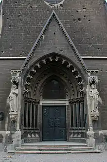 St Thomas' Church is a single-nave, cruciform church in the neo-Gothic style, 51.2 metres (168 ft 0 in) long and 28.0 metres (91 ft 10 in) wide. The gable roof has a height of 25.6 metres (84 ft 0 in) and the surrounding walls are made of bricks faced with limestone. In the south rises the church tower, which has a rectangular base and, with its height of 72 metres (236 ft), is one of the highest among Erfurt's churches. Inside, it contains a four-part chime and has several pointed-arched windows at the height of the bells. It is topped by a stone gallery and an octagonal, copper-roofed spire which, modelled on the Old St Thomas' Church, bears a tower clock with a spire on top in each compass direction. The nave seats a total of 2000 people and, unlike many other churches, the main altar is oriented to the north. Adjacent to the north side of the church are a chapel and a church hall whose vaulted cellar is used, among other things, as a band rehearsal room. The main portal in the south, also called Thomasportal, is flanked on the left by a statue of St Paul and on the right by a statue of St Thomas with a canopy and is decorated on each side by four columns. Originally, there was a figure of Christ above the portal, which was lost, however, during the bombing on Holy Saturday 1945. The door of the main portal is divided into twelve sections, each of which is decorated with a bronze relief plate designed by Werner Stötzer and depicting various scenes from the life of the apostle Thomas. Among them, for example, is the encounter between Thomas and the resurrected Christ (John 20) as well as Thomas' confession "My Lord and my God" (John 20:28).
