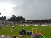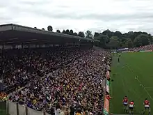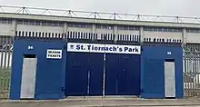 The ground is named after Saint Tiarnach (Tigearnach, d. AD 548), who founded Clones as a monastic settlement c. AD 500.[2] The Ulster Final was held in Clones from 1905 until 2004. Prior to this, a mixture of grounds were used as venues for the Ulster final. Between 2004 and 2006, due to increased capacity, the Ulster Final was played at Croke Park in Dublin.[3][4] However, with the 2007 Leinster Senior Football Championship final being scheduled for the same date, that year's Ulster Final was restored to Clones, with Tyrone narrowly defeating Monaghan by a scoreline of 1–15 to 1–13.[5] The Ulster Final has been held in Clones every year since 2007. The capacity of St Tiernach’s Park capacity was originally 36,500 spectators, but that was reduced in 2019 following a health and safety review.[1] 2019 marked the 75th anniversary of St Tiernach's Park.