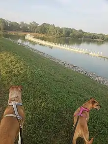 Two dogs check out the boardwalk