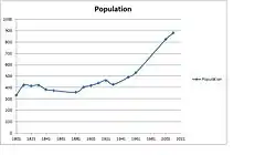 The population of Standon saw little fluctuation between 1801 and 1931, with the lowest being 332 in 1801 and the highest being 464 in 1921.[14] However, after 1931, there was a dramatic increase in population size even with the boundary change in 1932, meaning that the area of Standon decreased by 439 acres. The population in Standon in 1931 was 428 but increased exponentially to 879 in 2011.[15]