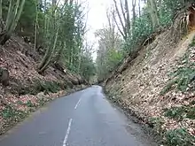 Although no conclusive evidence for the route has been found in the 5 km (3 mi) 'gap' between the Mole crossing and North Holmwood, Stane Street is thought to have passed through Dorking which was a Romano-British settlement.[9] In the 1960s, the historian Ivan Margary proposed that the road headed directly for the town centre from the Burford Bridge, an alignment that would have taken it beneath the present day Ashcombe School site. However, excavations in the mid-2000s at Westhumble and Denbies Wine Estate failed to find any trace of the road along his proposed route.[46][note 2] The current consensus is that this section of Stane Street most likely lies under the A24 dual carriageway.[49]
