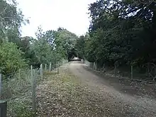 A rare example of a Roman barrow, a circular mound roughly 32 m (105 ft) in diameter and 3.4 m (11 ft) high, survives in Morden Park approximately 350 m (380 yd) west of the road.[36] From Morden, Stane Street passes through Sutton Common and forms the northern boundary of Sutton. The name 'Sutton' is derived from Old English sūth and tūn, meaning "the south enclosure",[37] which may relate to its position in relation to the road.[38] Stane Street runs along the western boundary of Nonsuch Park as it enters Surrey to the northeast of Ewell.[39]