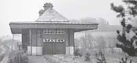 The station was originally part of the Paisley and Barrhead District Railway. The line was opened in 1897 and used for freight until the 1960s but none of the stations including this one opened for passenger travel. It was located directly to the south (toward the Gleniffer braes) of the castle in Stanely Dam.[1] The line ran along the edge of the dam to Glenfield.[2] The platform was the same long concrete island design as the other Paisley and Barrhead District Railway stations.[3]