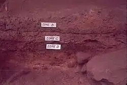 Zone B in the photograph of the stratigraphic zones contains specimens from the Morrow Mountain Phase of the Middle Archaic period. The excavation of this intermediate layer yielded three sets of human remains as well as projectile points, bone awls, and other tools. The youngest stratigraphic zone (Zone A, not shown in the photograph) contained specimens from the Archaic through Mississippian periods.