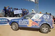 Led by Associate Professor Sebastian Thrun[2], director of the Stanford Artificial Intelligence Lab, the Stanford Racing Team was developed solely for the purpose of competing in the 2005 DARPA Grand Challenge. Stanford did not participate in the 2004 DARPA Grand Challenge and was considered to have 20:1 chances of winning the 2005 competition.[3] The car is currently located at the Smithsonian National Air and Space Museum. It was displayed at the 2006 New York International Auto Show and two years at the Volkswagen Autostadt Museum (Germany). The Stanford Racing Team entered a new vehicle, a modified Volkswagen Touareg wagon, dubbed "Junior", in the 2007 DARPA Urban Challenge.[4] Other key contributors on the team include Michael Montemerlo (software lead), Sven Strohband (lead hardware engineer), David Stavens (roboticist/engineer), Hendrik Dahlkamp (computer vision lead), Cedric Dupont (vehicle lead), and Pamela Mahoney (communications lead).[5]