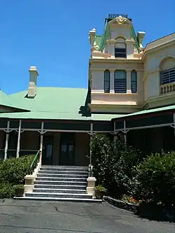 Stanley Hall's complex form reflects its different stages of construction. The ground floor (1885–86) is oriented north-east, whilst the upper floor (1890) is orientated east west, creating another primary frontage for the building. The eastern elevation is asymmetrical and steps back to a single-storeyed bay to the south, with a two-storeyed bay at the northern end adjacent to an off-centre tower which rises to three storeys. The northern elevation is a more formal arrangement of two-storeyed bays flanking a now enclosed verandah. A ground floor timber verandah encircles the building. The corrugated iron roof comprises hipped roofs over bays projecting from central hipped roofs to the ground and first floors, and skillions to the verandahs. The tower has a crested mansard roof.[1]