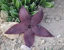 Stapelia grandiflora is a species of flowering plant in the genus Stapelia of the family Apocynaceae.[1] It is commonly referred to as the carrion plant, starfish flower, giant toad plant, or starfish cactus, although it is not related to cacti at all.[3] This "carrion plant" nickname can also refer to similar Stapelia species as well as members of related genera, including Stapelia gigantea and Orbea variegata. Stapelia grandiflora sometimes also goes by the name of Stapelia flavirostris.[2][3] The plant is native to South Africa, including the Northern Cape, Eastern Cape, and Free State.[4]