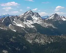 Star Peak is a 8,690-foot (2,650-metre) mountain summit located in the Methow Mountains, a sub-range of the North Cascades in Washington state. The peak is the highest point on Sawtooth Ridge. It is protected by the Lake Chelan-Sawtooth Wilderness within the Okanogan–Wenatchee National Forest. The nearest higher peak is Oval Peak, 2.52 miles (4.06 km) to the north.[1] Precipitation runoff on the south side of the mountain drains into Lake Chelan via Prince Creek, whereas the north side of the mountain drains into Buttermilk Creek which is a tributary of the Twisp River.