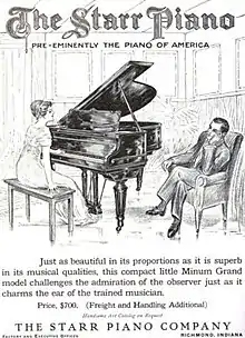 In the 1890s, pianos were so popular in America that one hundred companies were making them.[1] Between 1893 and 1949 Starr produced nearly a dozen brands, Trayser, Duchess, Richmond, Remington, and Royal, and bought other piano companies like Krell in 1927.[2][3] In 1915, 250 companies were making pianos, 75 percent from 25 companies that included Starr, Baldwin, and Wurlitzer.[1] For its craftsmanship, Starr won awards at the St. Louis World's Fair (1904), Tennessee Centennial Exposition (1907), Alaska–Yukon–Pacific Exposition (1909), and the Panama–Pacific International Exposition (1915).[1] Starr sold fifty styles that included a baby grand piano (the Minum), a four-foot tall model designed for apartments (the Princess), and player pianos.[1]