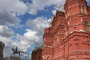 The State Historical Museum (Russian: Государственный исторический музей, ГИМ, romanized: Gosudarstvennyy istoricheskiy muzey, GIM) of Russia is a museum of Russian history located between Red Square and Manege Square in Moscow. The museum's exhibitions range from relics of prehistoric tribes that lived in the territory of present-day Russia, to priceless artworks acquired by members of the Romanov dynasty. The total number of objects in the museum's collection numbers in the millions.