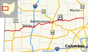 State Route 47 (SR 47) is a state highway running from the Indiana border at Union City to Waldo, about ten miles (16 km) south of Marion. In Bellefontaine, State Route 47 follows the path of different streets (even though neither are one-way) from Main Street and Sandusky Avenue to the intersection just north of Mary Rutan Hospital, about one-half mile north of the Main-Sandusky intersection. The westbound portion of State Route 47 goes down Main, while the eastbound portion goes north on Madriver Street during this stretch. Nobody really knows why the route was designated this way when none of the streets involved are one-way. It was State Route 68 until 1933, when U.S. Route 68 was commissioned. Since both roads run through a common county in Ohio (Logan), and also since there is a rule that there can be no Ohio State Routes with the same number as US highways within Ohio, the number was changed to 47.