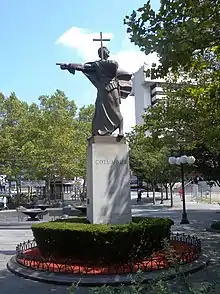 The Columbus statue at Journal Square (40°43′56″N 74°03′47″W / 40.732142°N 74.063114°W) in Jersey City was dedicated on October 15, 1950. Originally situated in a traffic island across from Loew's Jersey Theatre in 1998 it was moved to a pedestrian plaza. The ten-foot bronze statue is mounted on a white marble shaft and depicts Columbus "in a militant pose, holding a cross in his left hand and pointing westward with his right."[7] Funding for the statue was through private subscription. While on county-owned land, it is not property of the county and is partially maintained by the local chapter of the Dante Alighieri Society.[8][9] A plaque was added to the pedestal when rededicated on October 12, 1992, in memory of Edward F. Zampella, the "Voice of the Columbus Day Parade."[10]