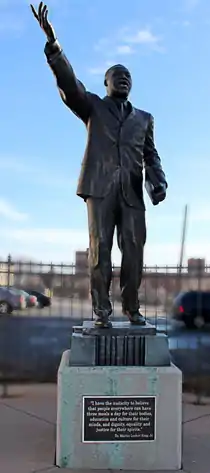 Dr. Martin Luther King Jr. is a 1998 public art work designed by American artist Erik Blome, located in downtown Milwaukee, Wisconsin.[1] The bronze sculpture depicts the civil rights movement leader Martin Luther King Jr. standing on a pedestal of books. It was commissioned by the YWCA of Greater Milwaukee and is located in front of the King Heights apartments.[2]