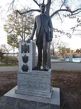 A statue of Boston mayor and state governor Maurice J. Tobin by Emilius R. Ciampa is installed along the city's Charles River Esplanade, in the U.S. state of Massachusetts.