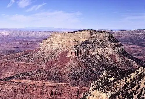 Steamboat Mountain is composed of Permian Kaibab Limestone, overlaying a conspicuous band of cream-colored, cliff-forming, Permian Coconino Sandstone.[8] The sandstone, which is the third-youngest of the strata in the Grand Canyon, was deposited 265 million years ago as sand dunes. Below the conspicuous Coconino Sandstone layer is slope-forming, Permian Hermit Formation, which in turn overlays the Pennsylvanian-Permian Supai Group.[9] Further down are strata of Mississippian Redwall Limestone, the Cambrian Tonto Group, and finally Paleoproterozoic Vishnu Basement Rocks at river level in Granite Gorge.