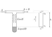 In the analysis of the system, various assumptions are made. The liquid, conventionally denoted A, is neither soluble in the gas in the tube, conventionally denoted B, nor reacts with it.[3] The decrease in volume of the liquid A and increase in volume of the gas B over time can be ignored for the purposes of solving the equations that describe the behaviour, and an assumption can be made that the instantaneous flux at any time is the steady state value.[4][2] There are no radial or circumferential components to the concentration gradients, resulting from convection or turbulence caused by excessively vigorous flow at the upper mouth of the tube, and the diffusion can thus be treated as a simple one-dimensional flow in the vertical direction.[1][6] The mole fraction of A at the upper mouth of the tube is zero, as a consequence of the gas flow.[2] At the interface between A and B the flux of B is zero (because it is insoluble in A) and the mole fraction is the equilibrium value.[6][4]