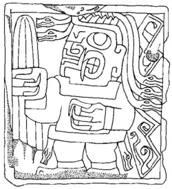 - Headstone VI-NW7 ("trumpeter", 'pututero'), next to the personage on headstone VI-NW6, represents an anthropomorphic being in profile, walking towards the western stairway (or southwest stairway) holding a conch shell or pututo with their right arm and blowing it.[26]