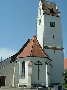 A church in Stetten was first mentioned in 1275[2] dedicated to Saint Stephen. The core of the current building is Late Gothic represented by its still existing choir. A tower was erected in 1555. The church was partially burnt down in 1646 during the Thirty Years' War by Swedish troops.[3] At the beginning of the 18th century the church was extended with a nave in Baroque style, work which seems to have included some interlacing stucco. In 1787 and 1788 the interior was overhauled in neoclassical style, and modernised during the 1880s.[5] Still noticeable is the mannerist tomb of Augustin Wiedemann, abbot of Wiblingen Abbey from 1572, who had previously been priest at Stetten, as well as several carved statues depicting Saint Zacharias and Saint Elizabeth from around 1725, a processional cross and an effigy of the resurrected Christ from 1735. The statues of Saint Barbara and Saint Dorothea from 1490 originally belonged to the altar of Mary in Achstetten.[3]