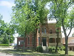 Steuben County Jail is a historic jail located at Angola, Steuben County, Indiana. It was built in 1877, and is a 2+12-story, brick and concrete building with Second Empire style design elements. It consists of an irregular main section with a rectangular prison wing at the rear. A porch was enclosed in 1961 and wing added in 1971. The main section is topped by a slate mansard roof and has an elaborate tower with a pyramidal roof and elaborate cupola.[2]:2