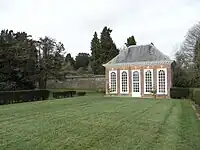 Two Palladian outbuildings serving as Orangery and "Library Room" [25] were built next to the house by John Rolle (1679–1730), MP, and the Library shows above the keystone of its central arch the arms of Rolle impaling the arms of the Walter Baronets of Sarsden, Oxfordshire, the family of his wife Isabella Walter (died 1734). Hoskins states that the manor house itself was rebuilt or remodelled sometime in the 18th century, Pevsner states c. 1709,[26] perhaps therefore at the same time as the building of the outbuildings. An engraving of this Georgian house survives, by James Bingley, published in 1831.