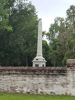 The monument is a large marble obelisk, rising to a height of 50 feet (15 m), with the base covering 30 square feet (2.8 m2).[17] It is located in the center of the cemetery near the Midway church, and it is the tallest structure in the cemetery.[18] Four copper plates adorn each face of the monument near its base, with the following inscriptions on them:[17]
