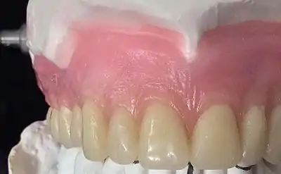 Photograph of a complete denture wax-up. The excessively detailed stippled surface texture of the base area (false gums) can be observed, mimicking the physiologic stippling of gum tissue in nature. Note how there is minimal to no stippling on the marginal gingiva, which is the millimeter or so of pink immediately adjacent to the teeth.