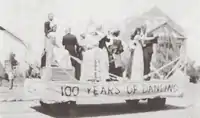 1938 Parade float celebrating Stirling Settler Days, commemorating the entry of Brigham Young and the first group of Mormon pioneers into the Salt Lake Valley on July 24, 1847. The 2nd LDS chapel in the background.