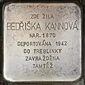 HERE LIVED BEDŘIŠKA KANNOVÁ BORN 1870 DEPORTED 1942 TO TREBLINKA MURDERED IBIDEM |