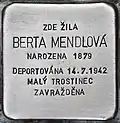 HERE LIVED BERTA MENDLOVÁ BORN 1879 DEPORTED 14.7.1942 MALY TROSTENETS MURDERED |