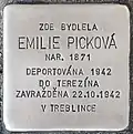 HERE LIVED EMILIE PICKOVÁ BORN 1871 DEPORTED 1942 TO THERESIENSTADT MURDERED 22.10.1942 IN TREBLINKA |