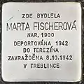 HERE LIVED MARTA FISCHEROVÁ BORN 1900 DEPORTED 1942 TO THERESIENSTADT MURDERED 8.10.1942 IN TREBLINKA |