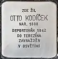 HERE LIVED OTTO KODÍČEK BORN 1888 DEPORTED 1942 TO THERESIENSTADT MURDERED IN AUSCHWITZ |