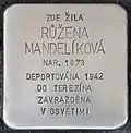 HERE LIVED RŮŽENA MANDELÍKOVÁ BORN 1873 DEPORTED 1942 TO THERESIENSTADT MURDERED IN AUSCHWITZ |