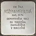 HERE LIVED RŮŽENA MEISLOVÁ BORN 1874 DEPORTED 1942 TO THERESIENSTADT MURDERED IN THERESIENSTADT |
