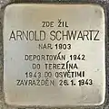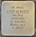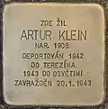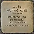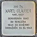 Karel Glauber, also Karl, was born on 14 June 1937 in Horažďovice. His parents were Valtr Glauber and Gertruda née Zinner (see below). On 26 November 1942, the boy was deported from Klatovy to Theresienstadt concentration camp by transport Cd. His transport number was 124 of 651. His mother was deported to Auschwitz concentration camp and murdered there on 16 January 1943. The little boy was deported on 18 December 1943 to Auschwitz by transport Ds. His transport number was 2219 of 2,503. There the Nazis took the life of the six years old boy.[16][17][18]