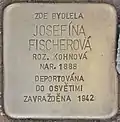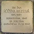 Růžena Adlerová née Fröhlichová was born on 16 June 1874. Her parents were Leopold Fröhlich and Barbora née Herrmann. She was married to Jakub Adler. The couple had at least three sons and two daughters, Josef (also Jozef, born 1904), Anna (born 1906, later named Pisinger), Ota (born 1908), Jindřiška (born 1910) and Jaroslav.[10] Her husband was a merchant, she was a housewife. She and her children Ota and Jindřiška were deported on 26 November 1942 from Klatovy to Theresienstadt concentration camp by transport Cd. Her transport number was 169 of 651. In Theresienstadt, the family was separated. First, in January 1943, her daughter Jindřiška was deported to Auschwitz concentration camp. She was murdered there. Then, on 6 September 1943, her son Ota was deported to Auschwitz. He was murdered there too. At last, on 15 December 1943, also Růžena Adlerová was deported to Auschwitz by transport Dr. Her transport number was 44 of 2,519. She was murdered there.[11][12]
