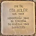 Ota Adler, also Otto, was born on 6 March 1908. His parents were Jakub Adler and Růžena née Fröhlichová. He had two sisters, Anna (born 1906) and Jindřiška (born 1910), and two brothers, Josef (born 1904) and Jaroslav.[4] His father was a merchant, his mother a housewife. He was a medical student and single. He, his mother and his sister Jindřiška were deported on 26 November 1942 from Klatovy to Theresienstadt concentration camp by transport Cd. His transport number was 170 of 651. In Theresienstadt, the family was separated. First, in January 1943, his sister Jindřiška was deported to Auschwitz concentration camp. She was murdered there. Then, on 6 September 1943, Ota Adler was deported to Auschwitz by transport Dl. His transport number was 1498 of 2,484. He was murdered there.[5] At last, also their mother was also deported to Auschwitz on 15 December 1943. She was also murdered there.[6]
