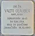 Valtr Glauber, also Walter, was born on 7 June 1899 in Horažďovice. His parents were David Glauber and Sophie née Langschur, also Zofie. He had four brothers: Emil (born 1895), Alfred (born 1897), Richard (born 1905) and Karl (born 1907). He was a merchant and married to Gertruda née Zinner (see below). The couple had a son, Karel, born in 1937 (see above). There is conflicting information about the place and the date of his death, ranging from 26 November 1942 in Ústí nad Labem to 18 July 1944 at Auschwitz concentration camp.[19][20]