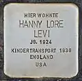 HERE LIVED HANNY LORE LEVI BORN 1924 KINDERTRANSPORT 1938 ENGLAND USA |
