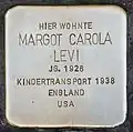 HERE LIVED MARGOT CAROLA LEVI BORN 1926 KINDERTRANSPORT 1938 ENGLAND USA |